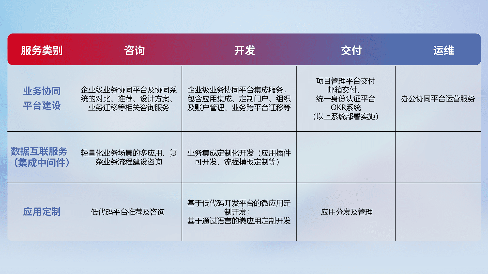 针对钉钉、、企微、、、、IDaas等平台级产品提供产品的规划、、方案、、、交付、、、、定制化开发等服务,,,实现如统一协同办公、、智能客户服务、、混合会议管理、、、、智能数据查询、、、、等业务场景,,实现数字化转型。。